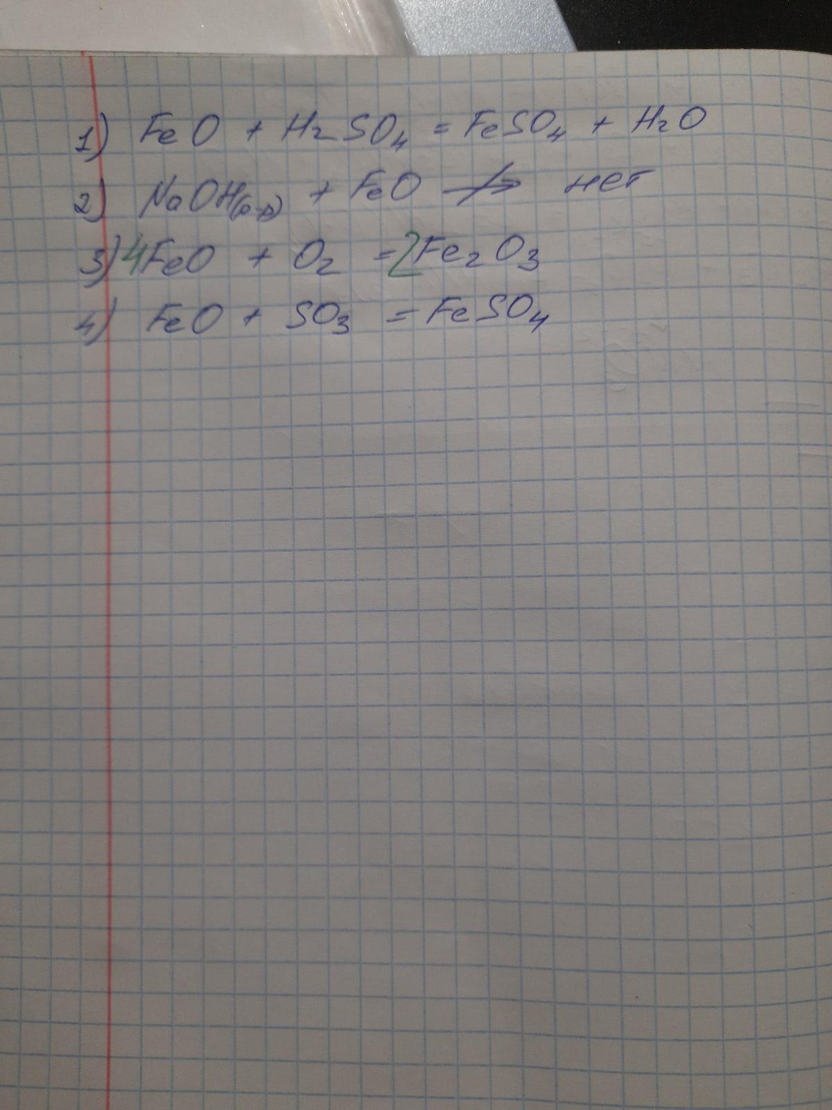 С какими из указанных веществ будет реагировать оксид железа (II): H2SO4 (разб.), NaOH (р-р), O2, SO3.