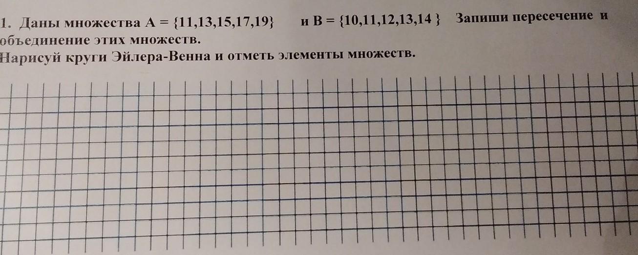 даны множества A=[11,13,15,17,19} и B={10,11,12,13,14} запиши пересечение и нарисую круги Эйлера Венна и отметь элементы множеств. кто ответит на того потпишусь