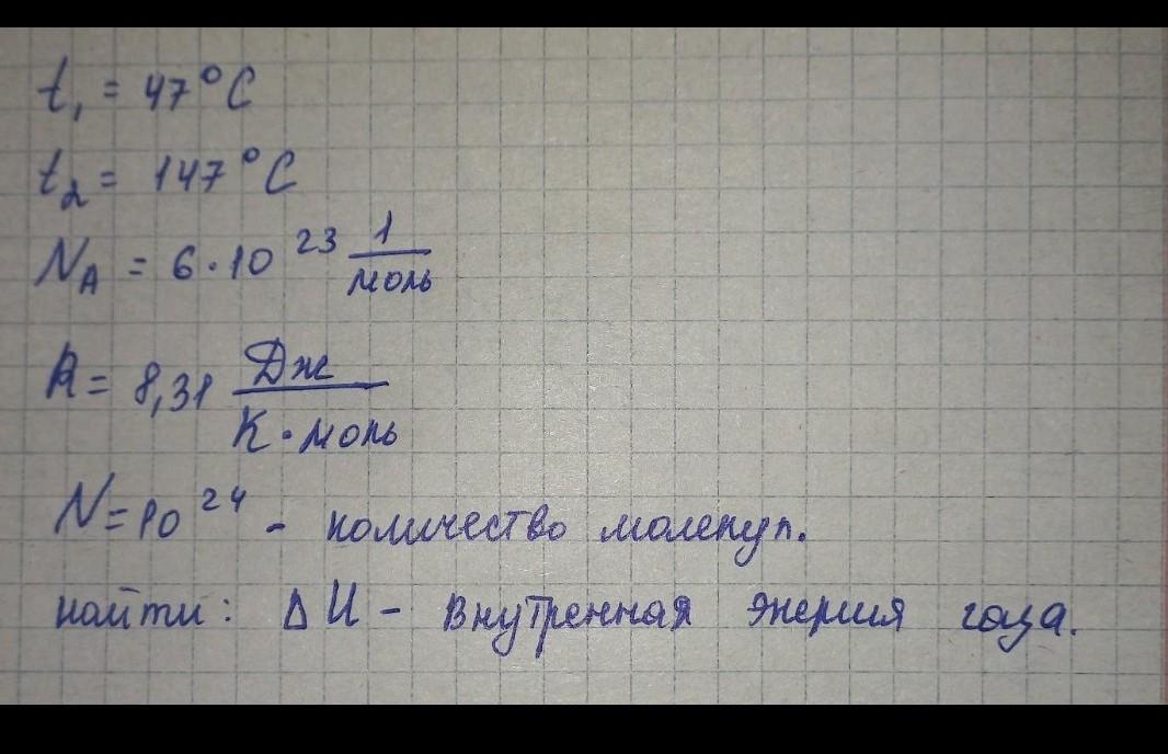 ΔU=3NR(T₂-T₁)/(2Nа)=3·10²⁴·8,31·(147-47)/(2·6·10²³)=2·10³Дж