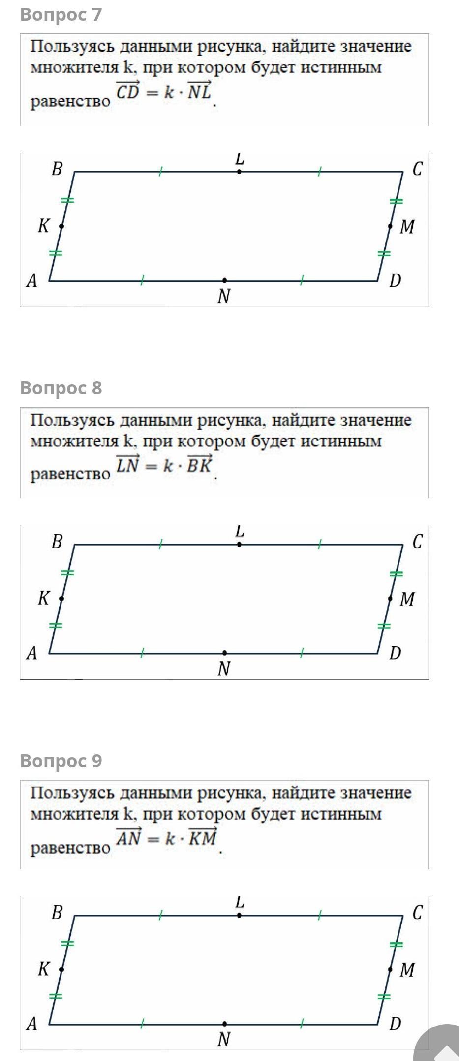 Помогите с тестом, пожалуйста. вопрос 7. Пользуясь данными рисунка, найдите значение множителя к, при котором будет истинным равенство CD=k·NL вопрос