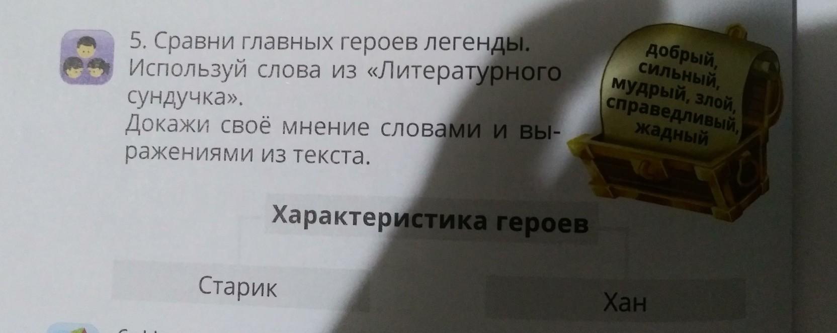 добрый, сильный, мудрый, злой, справедливый, жадный 5. Сравни главных героев легенды. Используй слова из «Литературного сундучка». Докажи своё мнение словами и вы- ражениями из текста. Характеристика героев Хан Старик