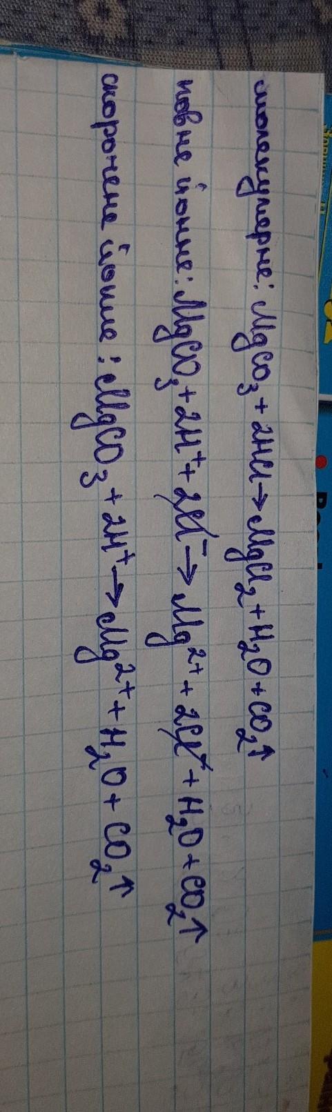 Рівняння хімічної реакції взаємодії магній карбонату з кислотою в молекулярній, повній та скороченій йонних формах:_________________ _________________________________________