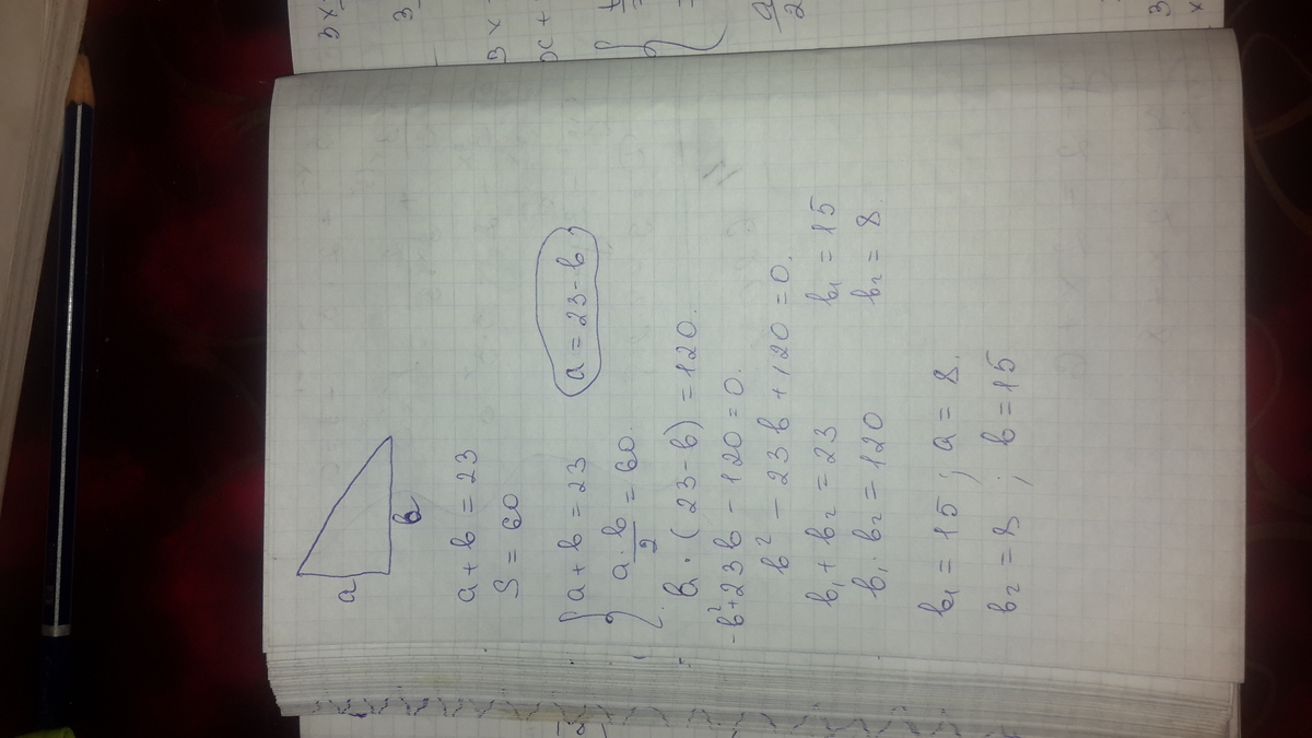 Помагите пожалуйста ) Найдите катеты прямоугольного треугольника, если известно, что их сумма равна 23 см, а площадь данного треугольника равна 60 см в квадрате.