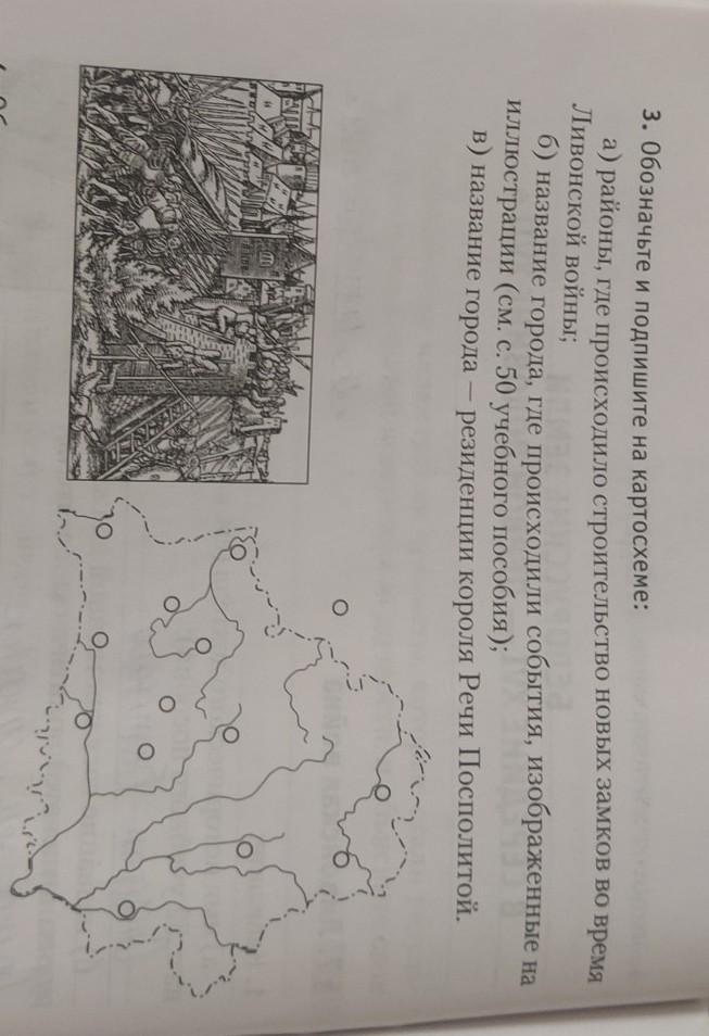 3. Обозначьте и подпишите на картосхеме: а) районы, где происходило строительство новых замков во время Ливонской войны; б) название города, где происходили события, изображенные на иллюстрации (см. с. 50 учебного пособия); в) название города резиденции короля Речи Посполитой. ..