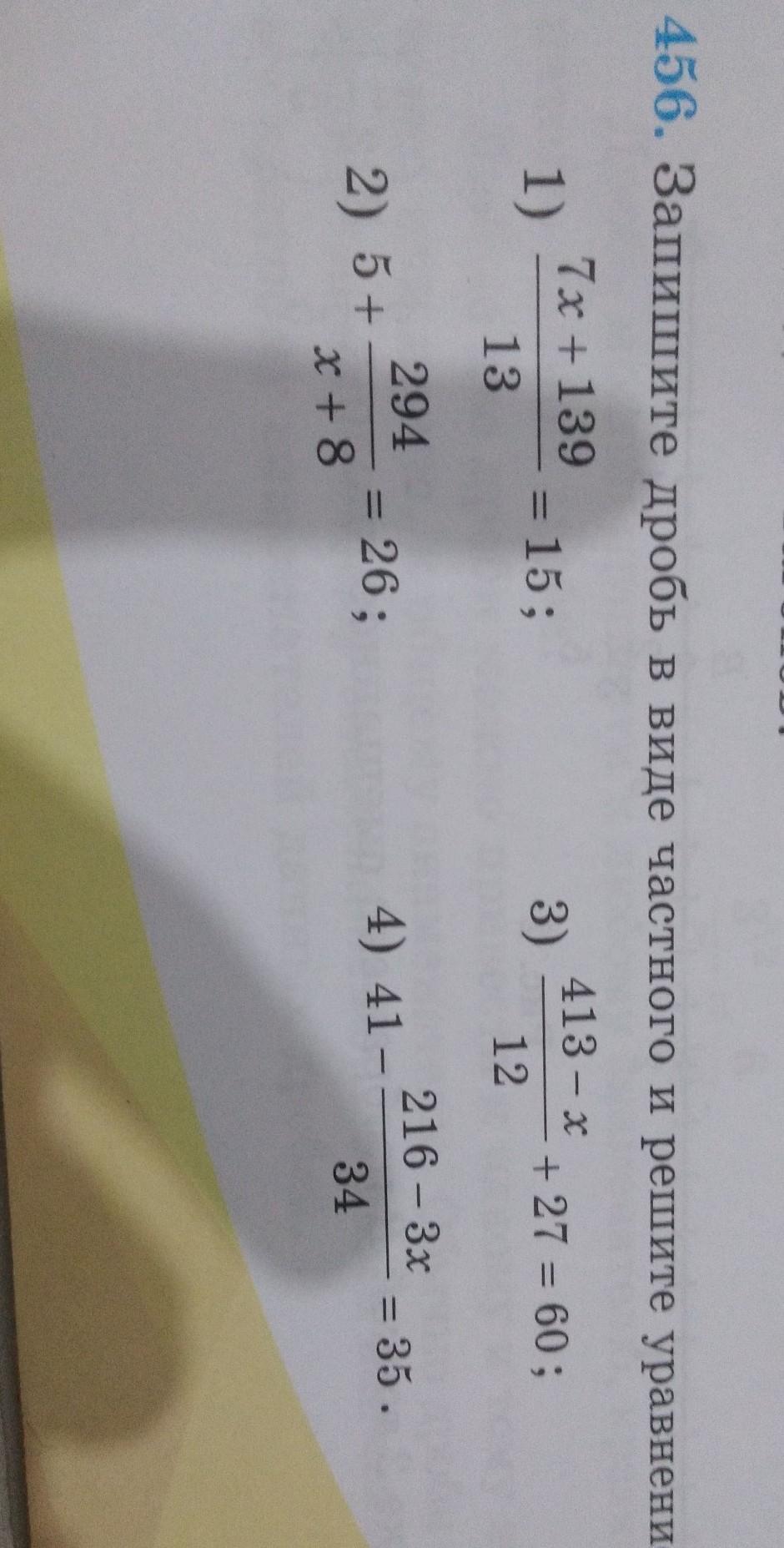 456. Запишите дробь в виде частного и решите уравнение: 7х + 139 413-2 1) = 15; 3) +27 = 60; 13 12 294 2) 5+ 26; 216-33 4) 41 - 34 = 35. х+8