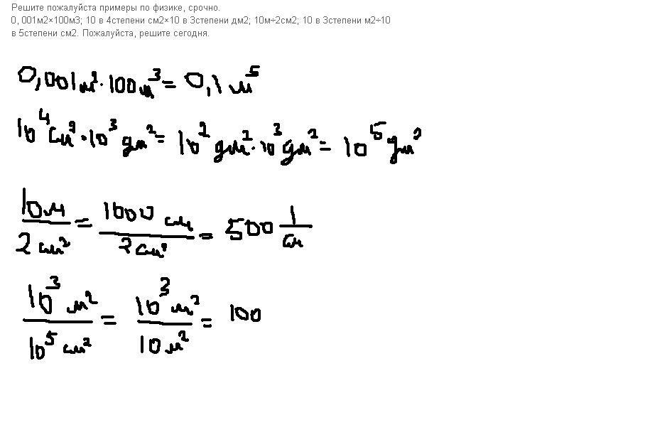 0, 001м2×100м3; 10 в 4степени см2×10 в 3степени дм2; 10м÷2см2; 10 в 3степени м2÷10 в 5степени см2. Пожалуйста, решите сегодня.