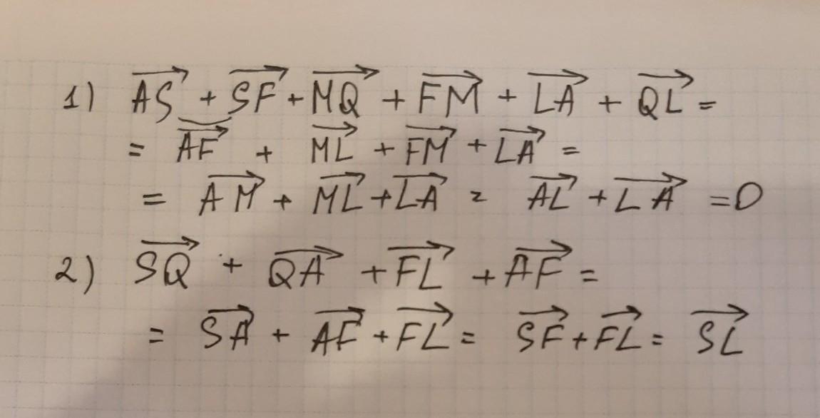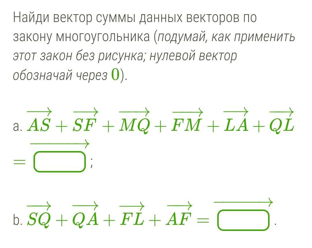 Найди вектор суммы данных векторов по закону многоугольника (подумай, как применить этот закoн без рисунка; нулевой вектор обозначай через 0).