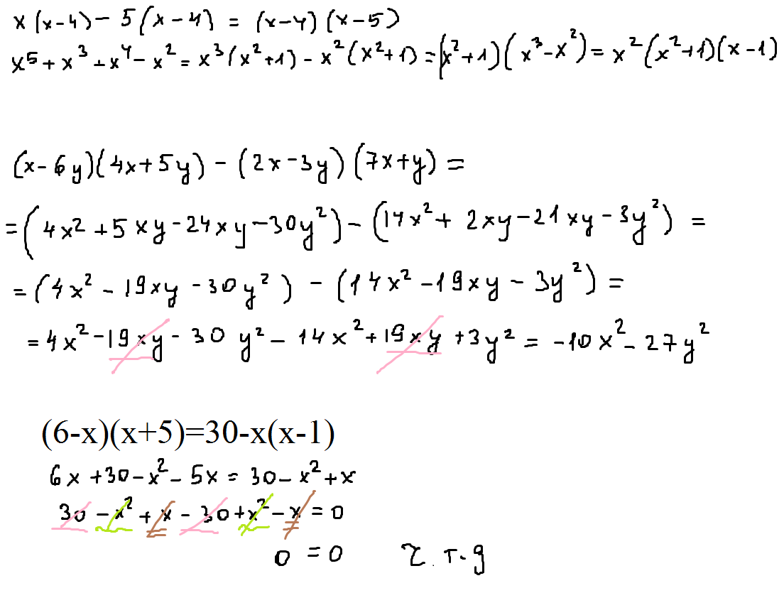 Как решить разложите на множетели a) x(x-4)-5(x-4): б) x^5+x^3-x^4-x^2 упростите выражение (x-6y)(4x+5y)-(2x-3y)(7x+y) докажите тождество (6-x)(x+5)=30-x(x-1)