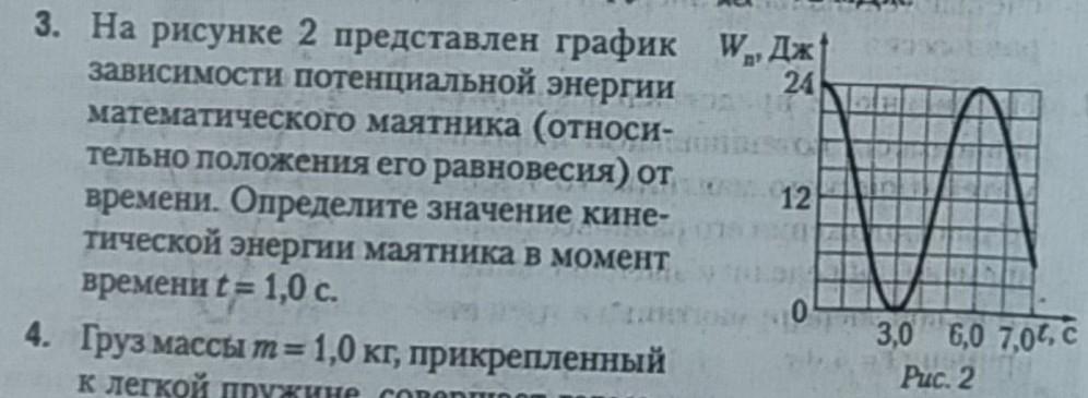 На рисунке 2 представлен график W, Дж зависимости потенциальной энергии математического маятника (относи- тельно положения его равновесия) от времени. Определите значение кине- тической энергии маятника в момент времени t = 1,0 с