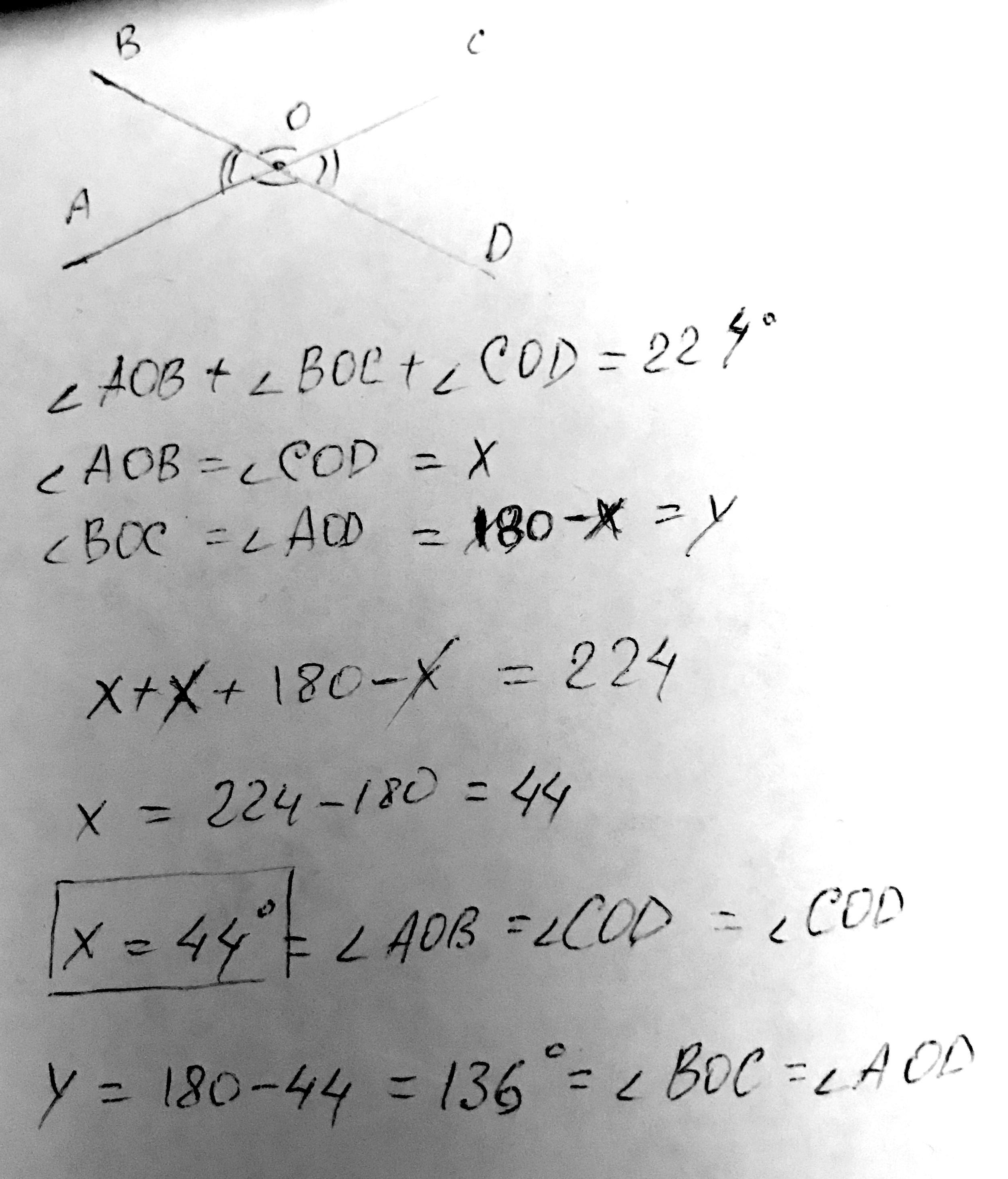 сумма трёх углов образованных при пересечении двух прямых равна 224°. Найдите градусную меру меньшего из образованых углов. Срочно!!!