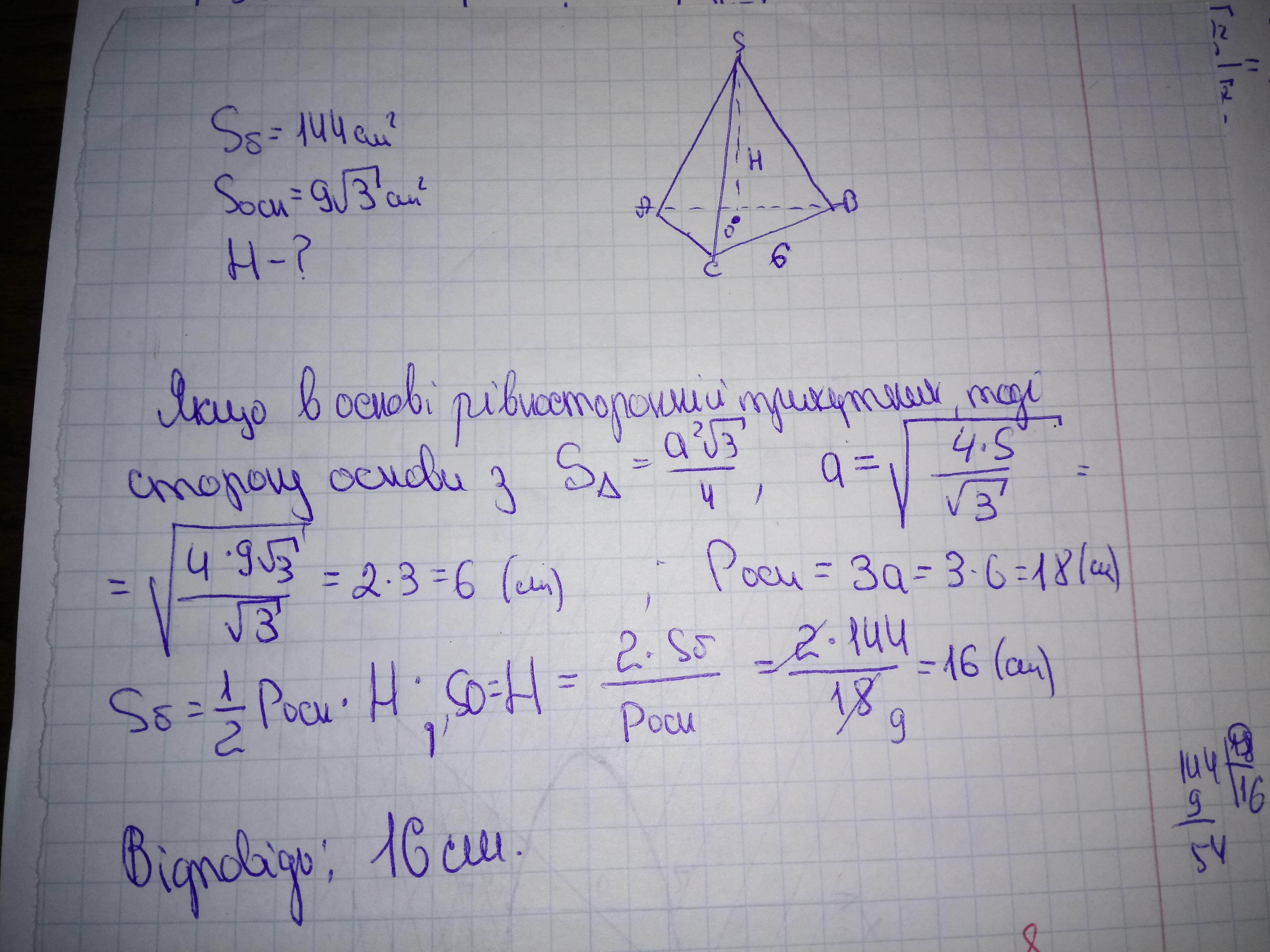 бічна поверхня трикутної призми 144см2, а площа основи