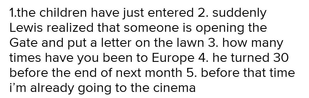 1. дети только что вошли 2. внезапно Льюис понял что кто-то открывает Калитку и положил письмо на лужайку 3. сколько раз Ты бывал в Европе 4. ему исполнилось 30 до конца следующего месяца 5. до того времени я уже Уйду в кино