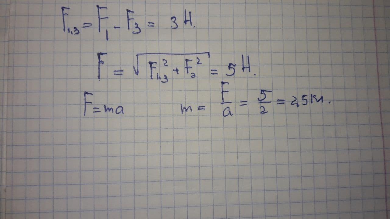 Определите массу тела, которое под действием трёх сил получило ускорение 2 м/с2.