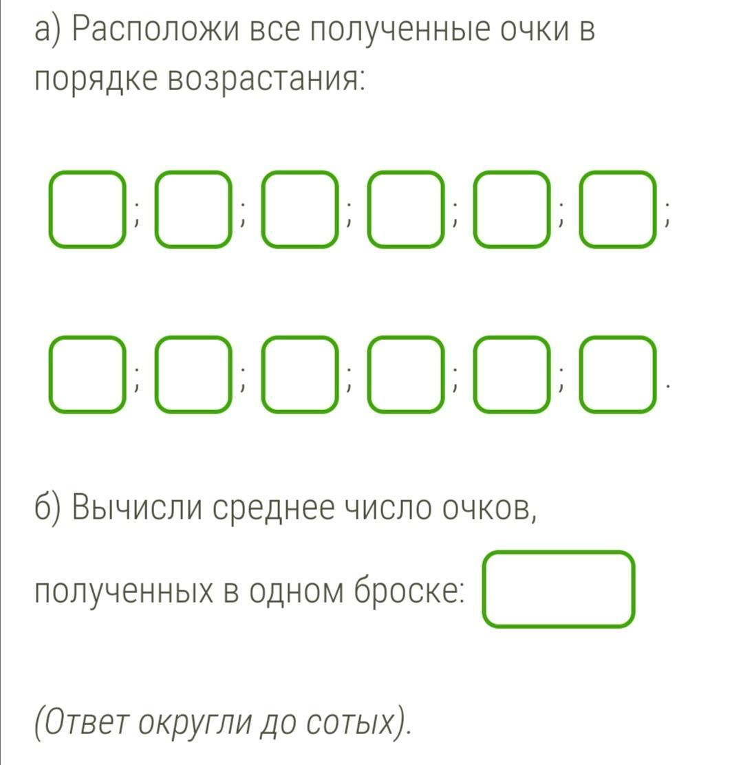 Марина метала дротики. После выполнения всех бросков 10 очков она заработала один раз, 12 очков — два раза, а 19 очк(-ов, -а), 6 очк(-ов, -) и 17 очков — каждое по три раза.