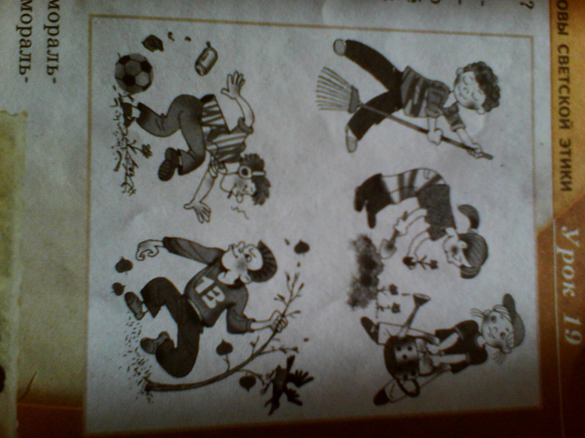 1. Рассмотрите рисунок (внизу) . Какие поступки с точки зрения добра и зла совершают изображенные на нем персонажи .