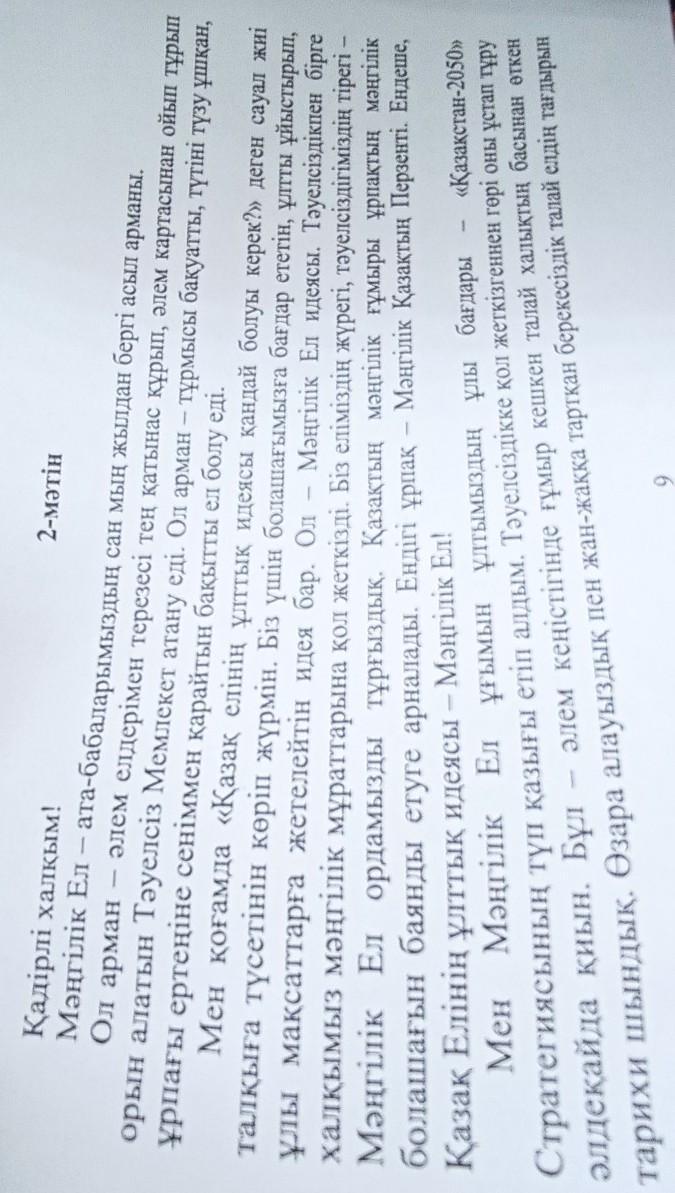 Казак халкынын басты кундылыктарынын бири ари бирегейи бул - тауелсиздик. Тауелсиздик жолында талай казак батырлары шейит болды.Ал матиндеги негизги ой осы Мангилик елдин негизги тиреги - Улы даланын жети кырын дариптеу аркылы озге елдерге жарияоау.