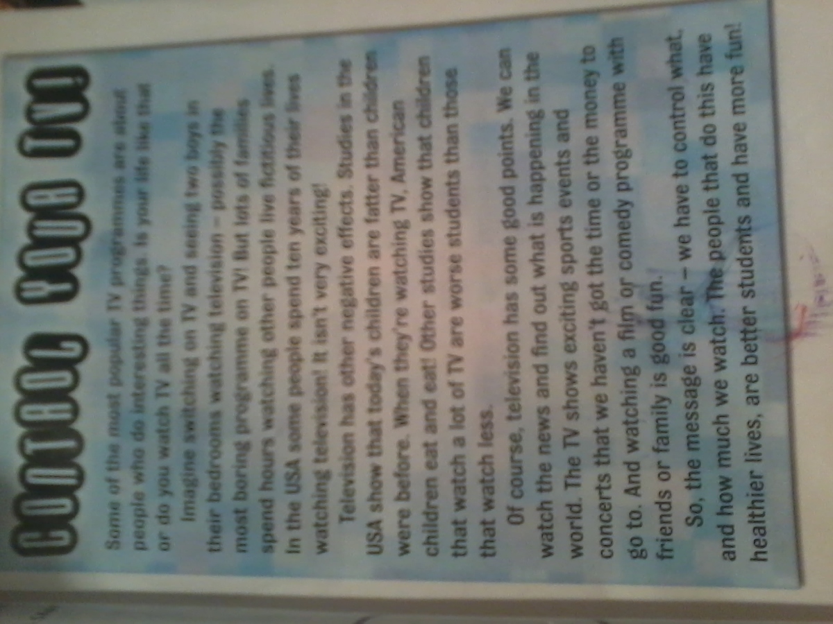 представь двух мальчиков, включивших и просматривающих телевизор в их комнатах - вероятно самая скучная программа на ТВ. Но многие семьи проводят часы, смотря как другие люди живут воображаемыми жизнями. В США некоторые люди проводят 10 лет своих жизней, смотря ТВ. это не очень привлекательно.