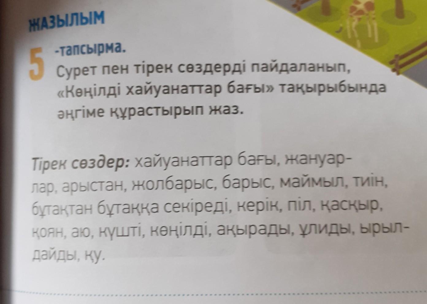 МАЗылым -тапсырма. 5 Сурет пен тірек сөздерді пайдаланып, «Көңілді хайуанаттар бағы» тақырыбында әңгіме құрастырып жаз. Тірек сөздер: хайуанаттар бағы, жануар- лар, арыстан, жолбарыс, барыс, маймыл, тиін, бұтақтан бұтаққа секіреді, керік, піл, қасқыр, коян, аю, күшті, көңілді, ақырады, ұлиды, ырыл- дайды, қу.