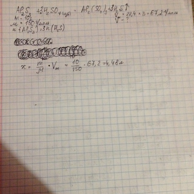 На 10 г сульфида алюминия подействовал избыток раствора серной кислоты. Какой объем газа ( при н.у.) выделиться при этом?
