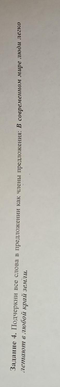Задание 4. Подчеркни все слова в предложении как члены предложения: В современном мире люди легко летают любой край земли.