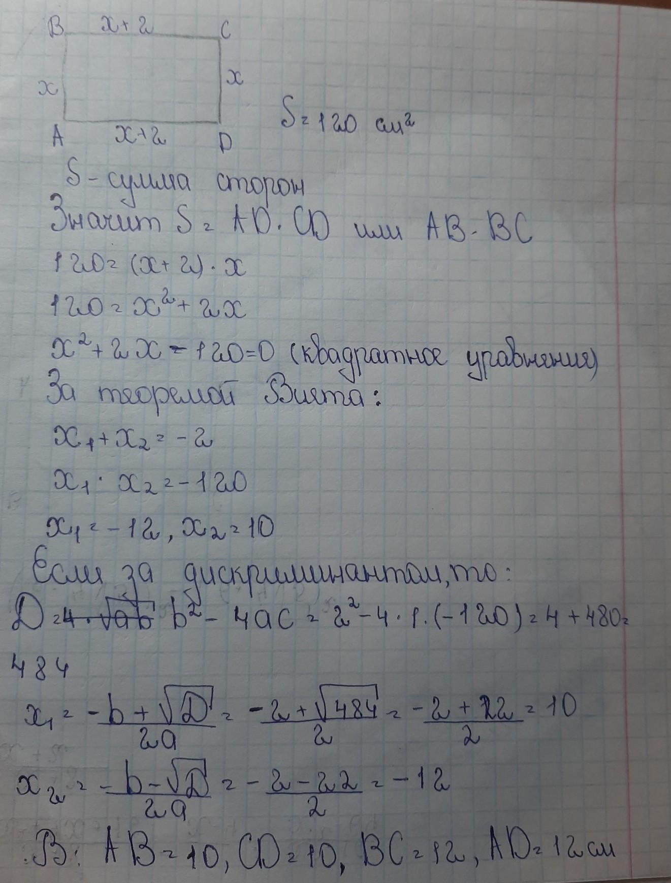 Одна сторона прямоугольника на 2 см длиннее чем другой.Если площадь прямоугольника равна 120 см²,найдите его стороны.