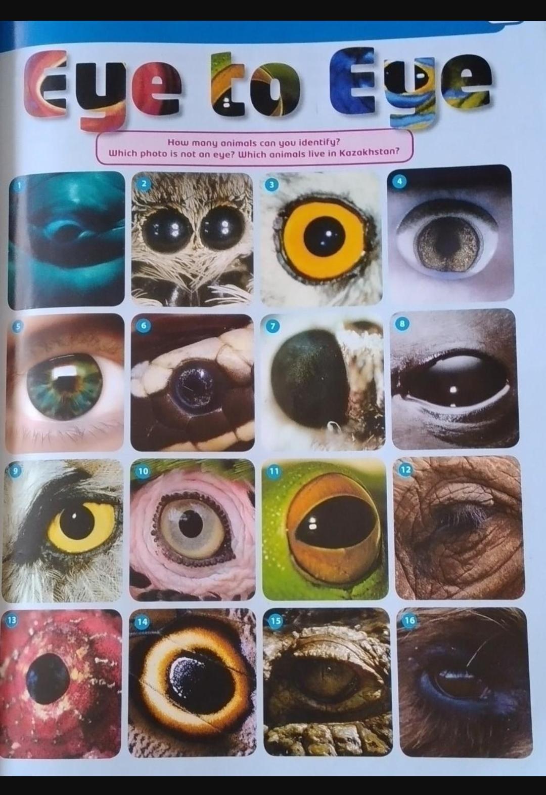 1 Match the animals in the box with photos 1–16 in the Eye to Eye quiz on page 33. Which photo is not an eye? snake frog elephant bear bear parrot owl shark crocodile whale spider seal butterfly falcon chameleon fly human