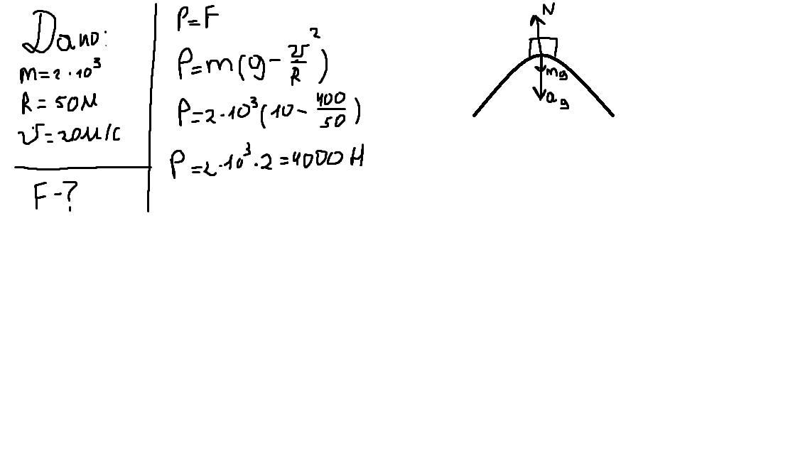 Автомобіль масою 2 т рухається по опуклому мосту радіусом 50 м зі швидкістю 72 км/год.