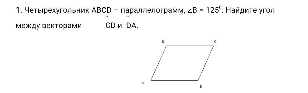 Четырехугольник ABCD - параллелограмм, уголB=125°.Найдите угол между векторами CD и DA