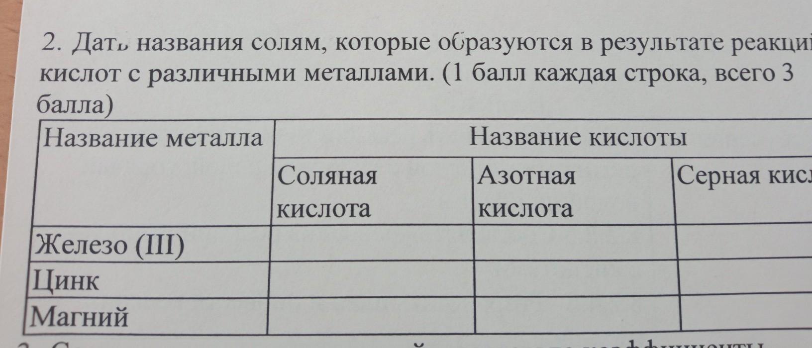 2. Дать названия солям, которые образуются в результате реакций кислот с различными металлами. (1 балл каждая строка, всего 3 балла) Название металла Название кислоты Соляная Азотная Серная кислота Кислота кислота Железо (II) Цинк Магний