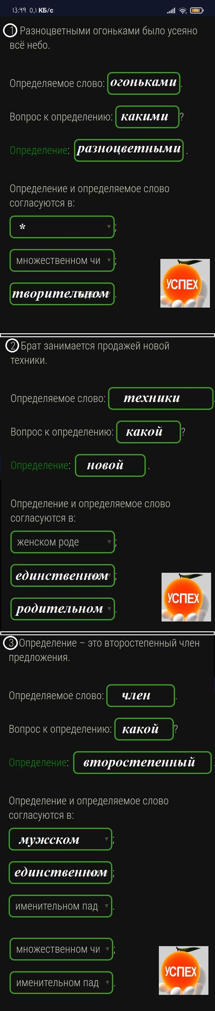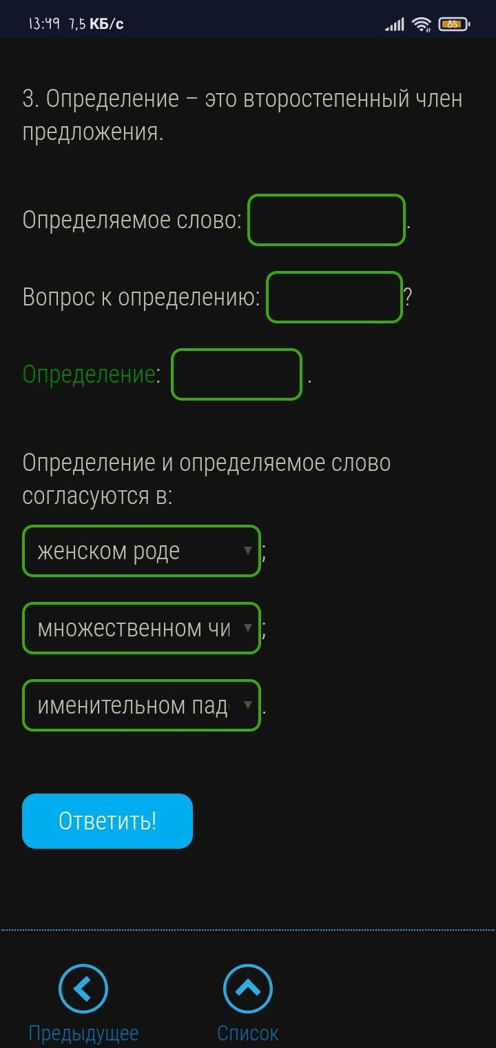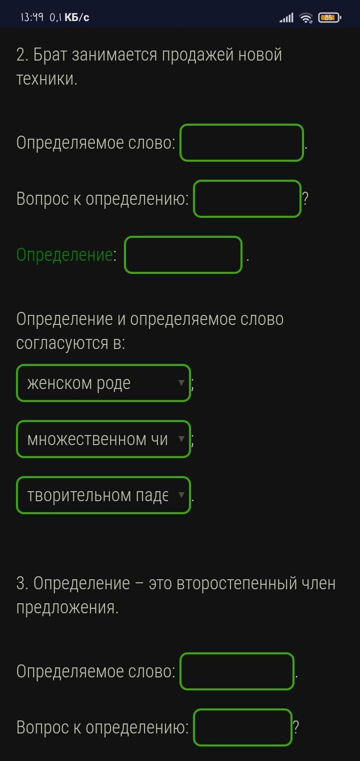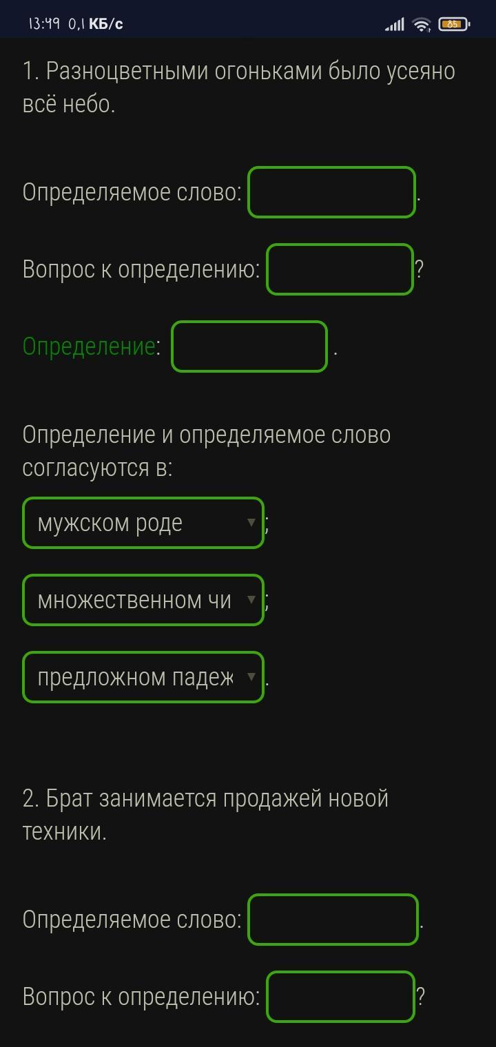 Выпиши из предложений определение с определяемым словом. Задай вопрос от определяемого слова к определению. Укажи род, число и падеж этих слов.