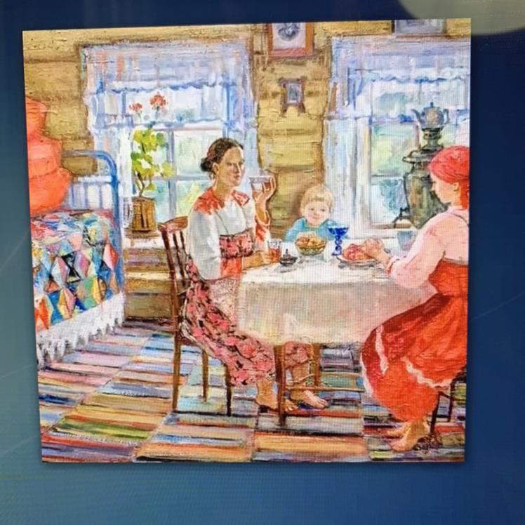 мальчик пирожки ест да в самовар пялится . мама с его сестрой пьют чай . и все следят молча и не говорят.Видемо очень вкусные они . Пирожки сейчас они покушают и пойду гулять.красивый самовар думает мальчик смотря в него