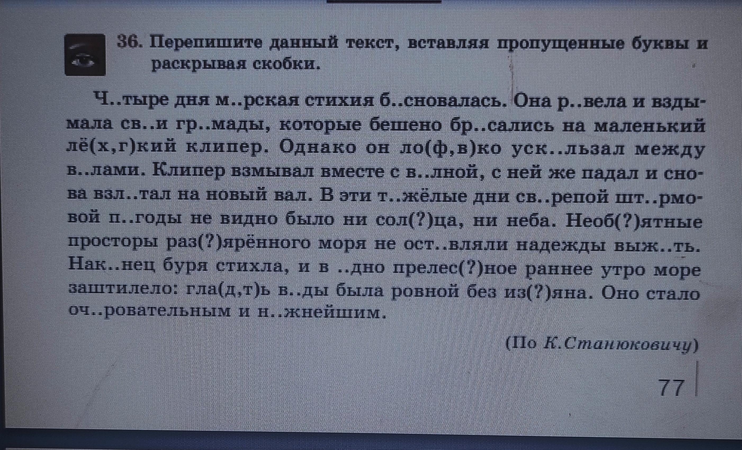 Ответ:Четыре дня морская стихия бесновала. Она ревела и вздымала свои громады, которые бешено бросались на маленький лёгкий клипер. Однако, он ловко ускользал между валами. Клипер взмывал вместе с волной, с ней же падал и снова влетал на новый вал. В эти тяжёлые дни, свирепой штормовой погоды, не видео было ни солнца, ни неба. Необъятные просторы разъярённого моря не оставляли надежды выжить. Наконец буря стихла, и в одной прелестное раннее утро море заштилело: гладь воды была ровной без изъяна. Оно стало очаровательным и нежнейшим.