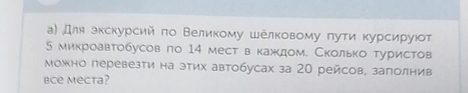 номер 6a для экскурсии по Великому шелковому пути курсирует в 5 микроавтобусов по 14 мест в каждом Сколько туристов можно перевести на этих автобусах это 20 рейсов Заполнив все места