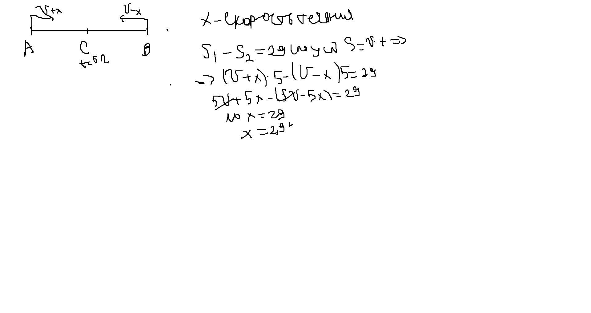 ПОМОГИТЕ!!!!!!! Одновременно от двух пристаней навстречу друг другу отошли две моторные лодки с одинаковыми скоростями. Через 5 ч. они встретились. Лодка, которая плыла по течению, прошла на 29 км больше, чем другая лодка. Бычисли скорость течения реки