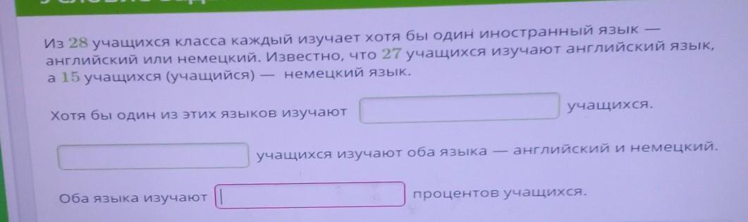 ПОМОГИТЕ!!!! Из 28 учащихся класса каждый изучает хотя бы один иностранный язык — английский или немецкий. Известно, что 27 учащихся изучают английский язык, а 15 учащихся (учащийся) — немецкий язык.