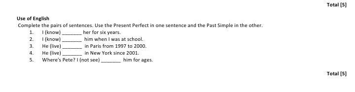 Total [5] Use of English Complete the pairs of sentences. Use the Present Perfect in one sentence and the Past Simple in the other. 1. I (know) _______ her for six years. 2. I (know) _______ him when I was at school. 3. He (live) _______ in Paris from 1997 to 2000. 4. He (live) _______ in New York since 2001. 5. Where's Pete? I (not see) _______ him for ages.