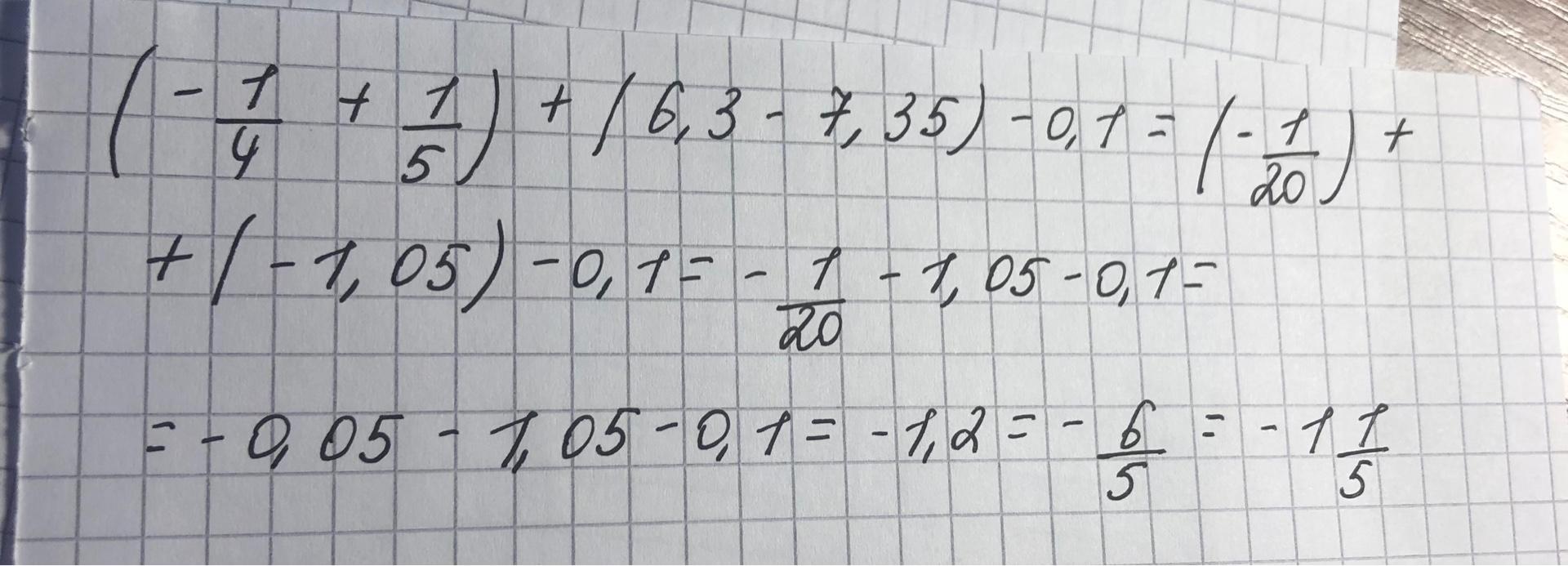 8.Найдите значения выражения : (-1/4+1/5)+(6,3-7,35)-(0,1) сделайте пожалуйста только решения по действиям в тетради или на листочке,ответов на это задание много но не понятно как,училка сказала нужно объяснение