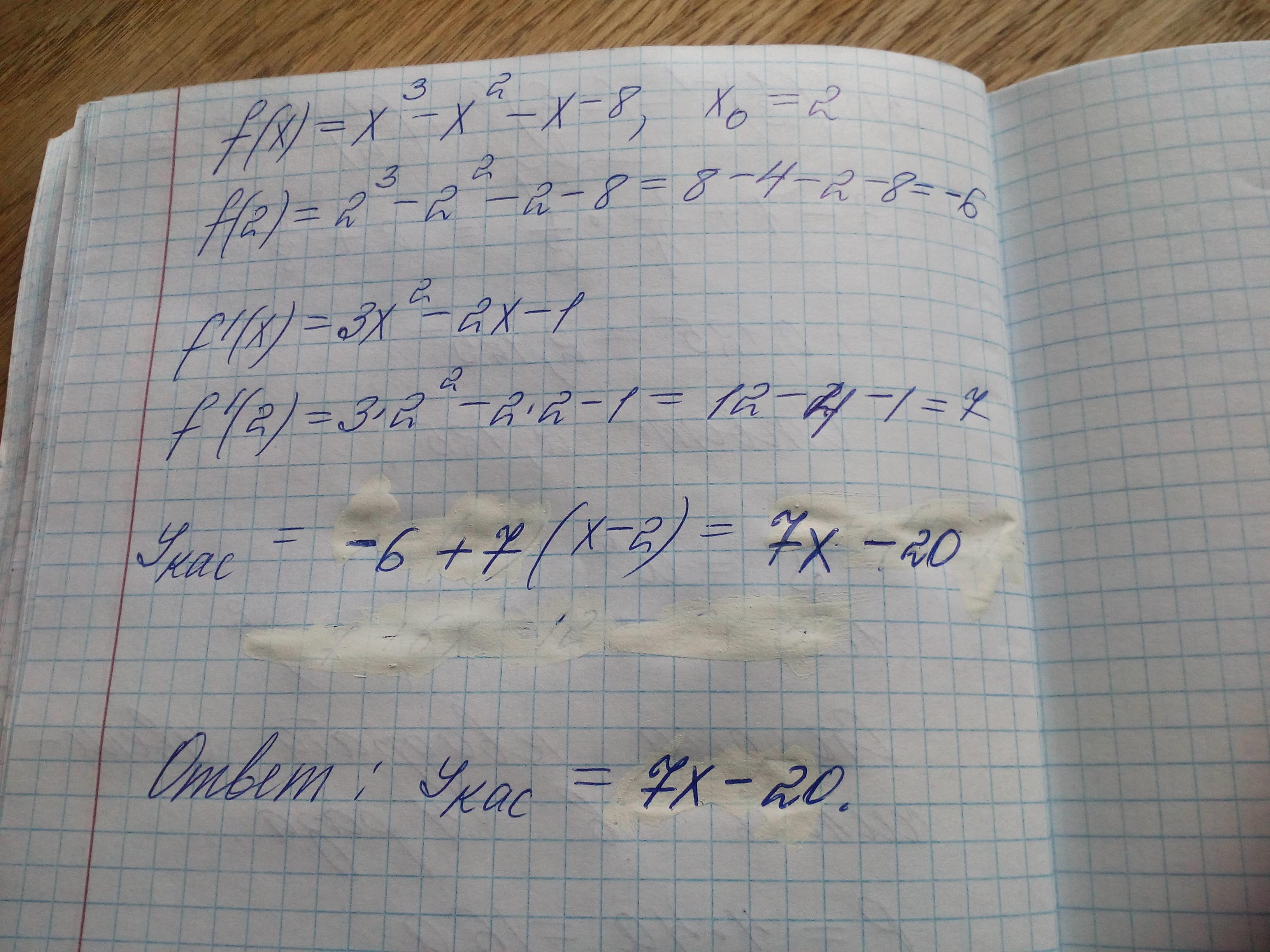 Складіть рівняння дотичної до графіка функції f у точці з абсцисою x0, якщо f(x)=x³-x²-x-8, x0=2