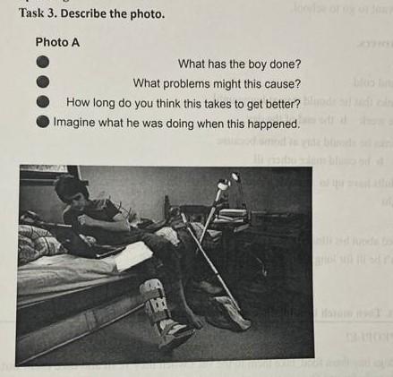What has the boy done? What problems might this cause? How long do you think this takes to get better? Imagine what he was doing when this happened.