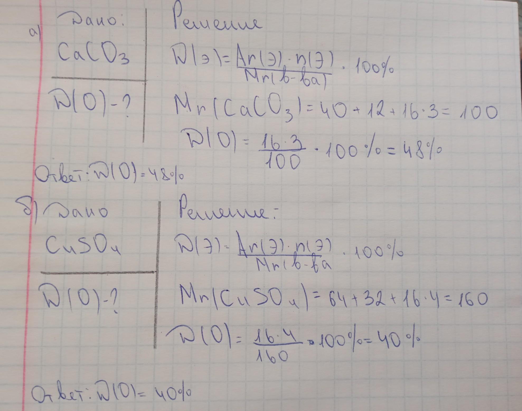 1)в решении сначала пишем формулу как найти массовую долю элемента, но для этого надо знать Мr