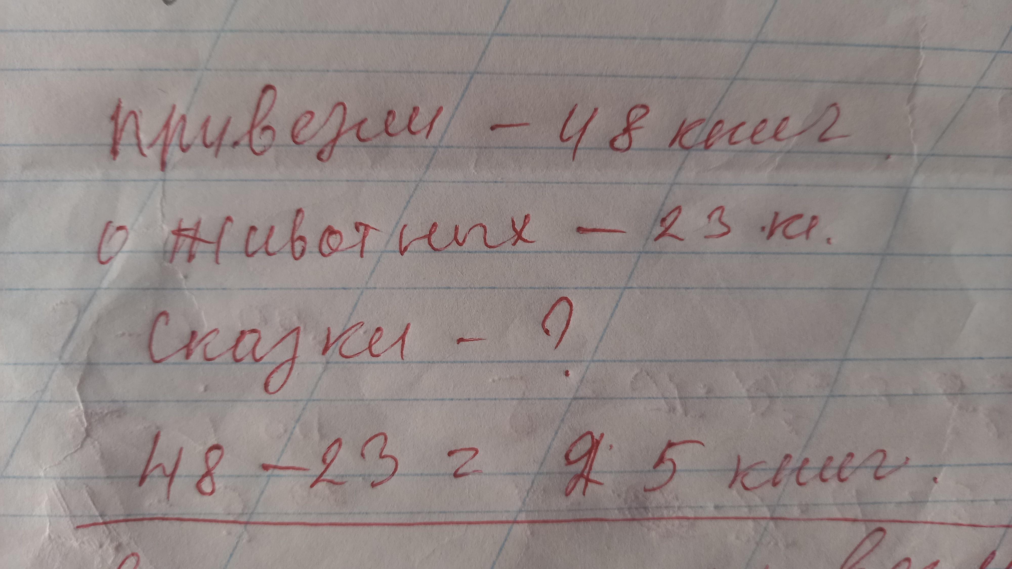 Как правильно написать план задачи в библиотеку привезли 48книг 23 книги были о животных а остальные сказки сколько книг со сказками привезли в библиотеку