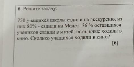750 учащихся школы съездили на экскурсию из них 80% ездили на медео 36% оставшихся учиников ездили в музей остальные ходили в кино сколько учащихся ходили в кино помогите ппппплллллз срочноооооо