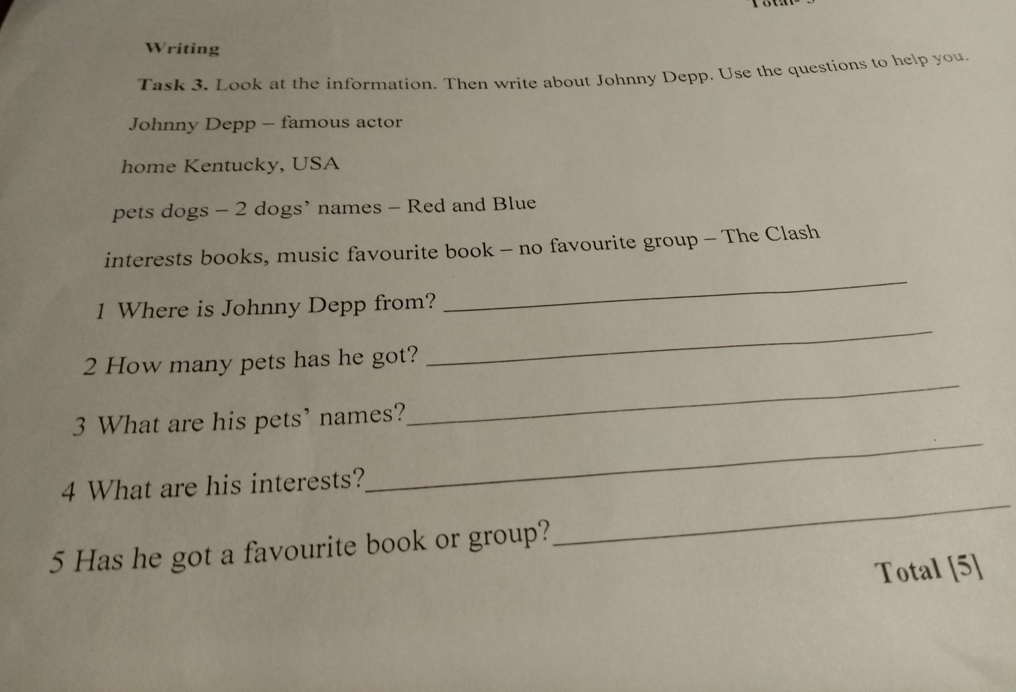 1 Where is Johnny Depp from? 2 How many pets has he got? 3 What are his pets' names? 4 What are his interests? 5 Has he got a favourite book or group?