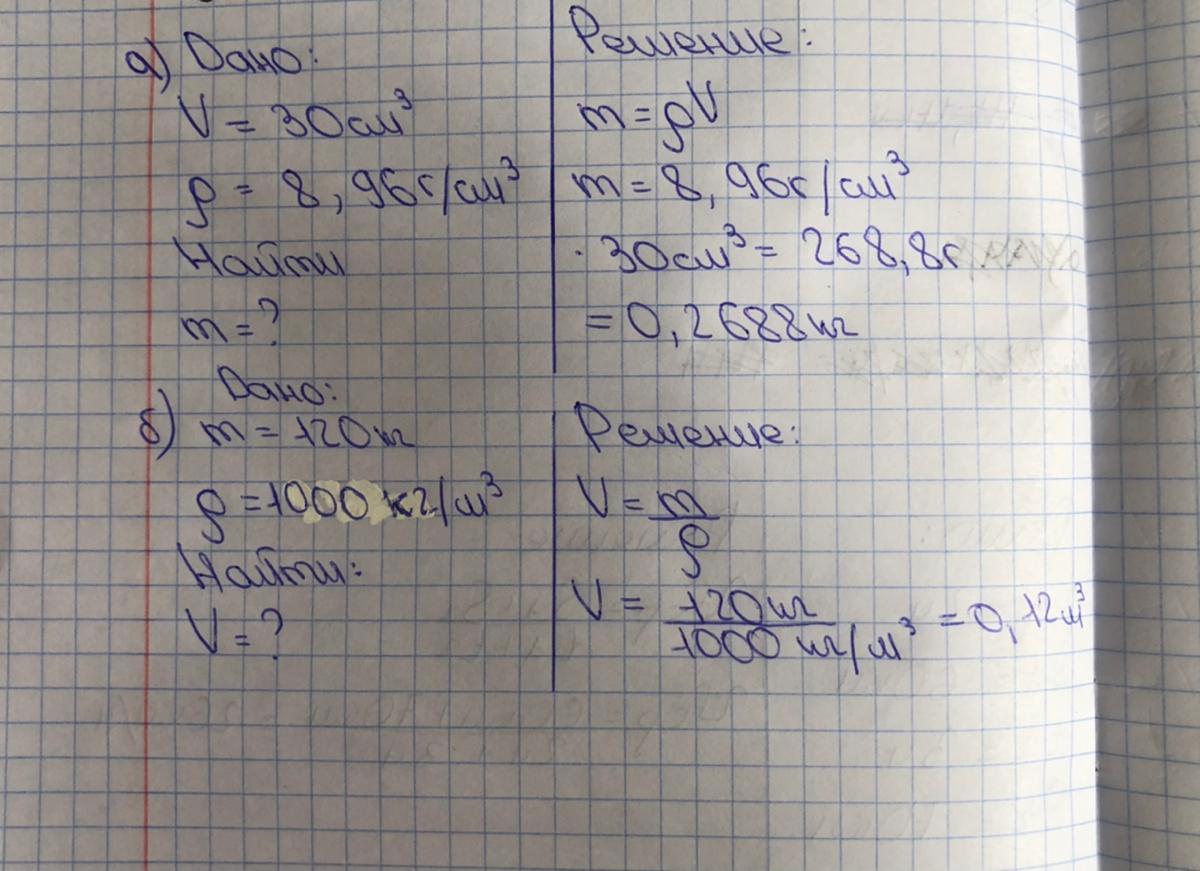 Плотность вещества : а) определить массу цилиндра изготовленного из меди, если его объем 30 см³ .б) определите объем деревянного бруска,масса корого 120 кг.
