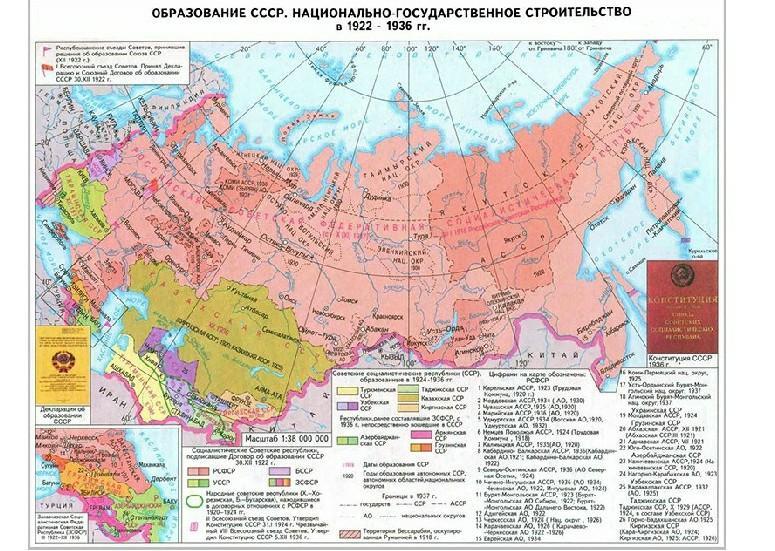 Советский Союз - государство, существовавшее в 1922-1991 на большей части территории бывшей Российской империи. В его состав добровольно по Договору об образовании СССР вошли (декабрь 1922) Белоруссия (БССР), Россия (РСФСР), республики Закавказья [ЗСФСР; с 1936 союзные республики Азербайджан (Азербайджанская ССР), Армения (Армянская ССР), Грузия (Грузинская ССР)] и Украина (УССР); в дальнейшем в 1925 Узбекистан (Узбекская ССР), Туркмения (Туркменская ССР), в 1929 Таджикистан (Таджикская ССР), в 1936 Казахстан (Казахская ССР), Киргизия (Киргизская ССР), в 1940 Молдавия (Молдавская ССР), Латвия (Латвийская ССР), Литва (Литовская ССР) и Эстония (Эстонская ССР).