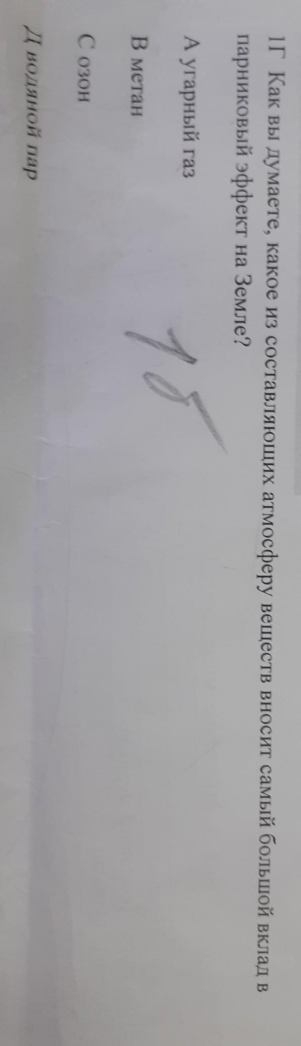 СРОЧНО ДАЮ 25 БАЛЛОВ СРОЧНО Г Как вы думаете, какое из составляющих атмосферу веществ вносит самый большой вклад в парниковый эффект на Земле? А угарный газ 7 . В метан Созон Д водяной па