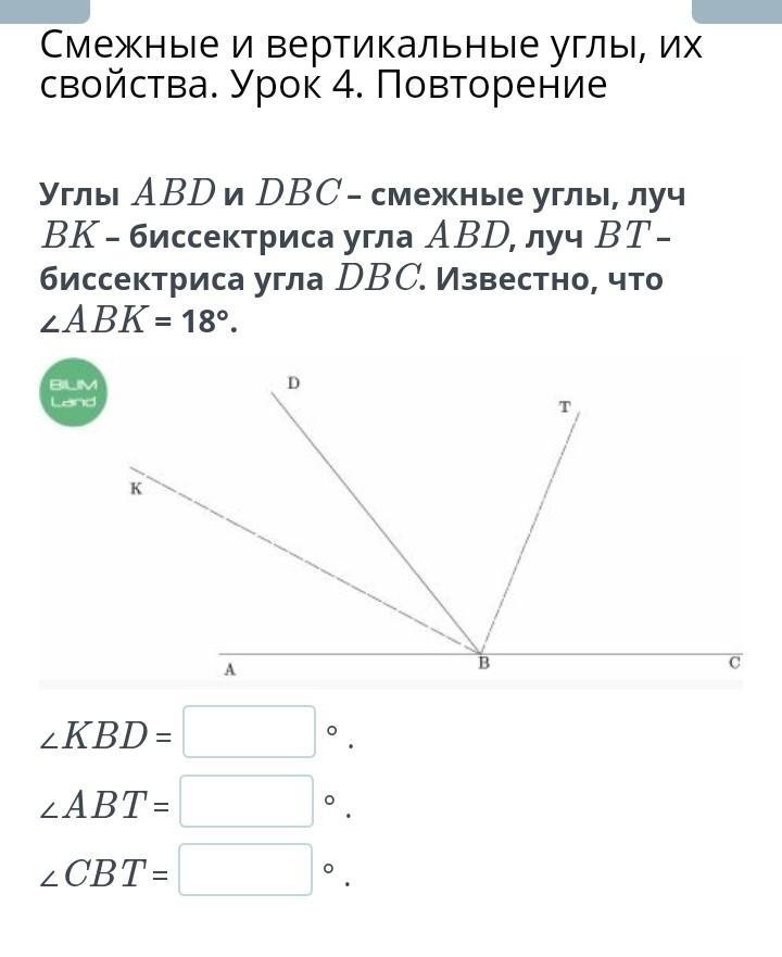 1). BK – биссектриса, значит уг. ABD = 2 * уг. ABK = 2 * 18° = 36°