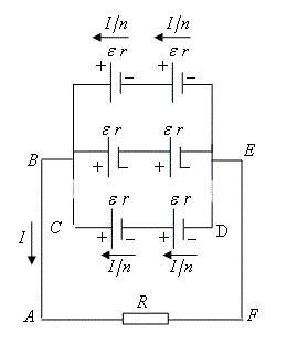 Внешняя цепь сопротивлением R=0,3 Ом питается от шести аккумуляторов, у каждого из которых ЭДС 2В, а внутреннее сопротивление 0,3 Ом. Аккумуляторы соединены в три параллельных группы, по два последовательно соединённых элемента в каждой. Зарисуйте схему и чему равна сила тока в цепи.