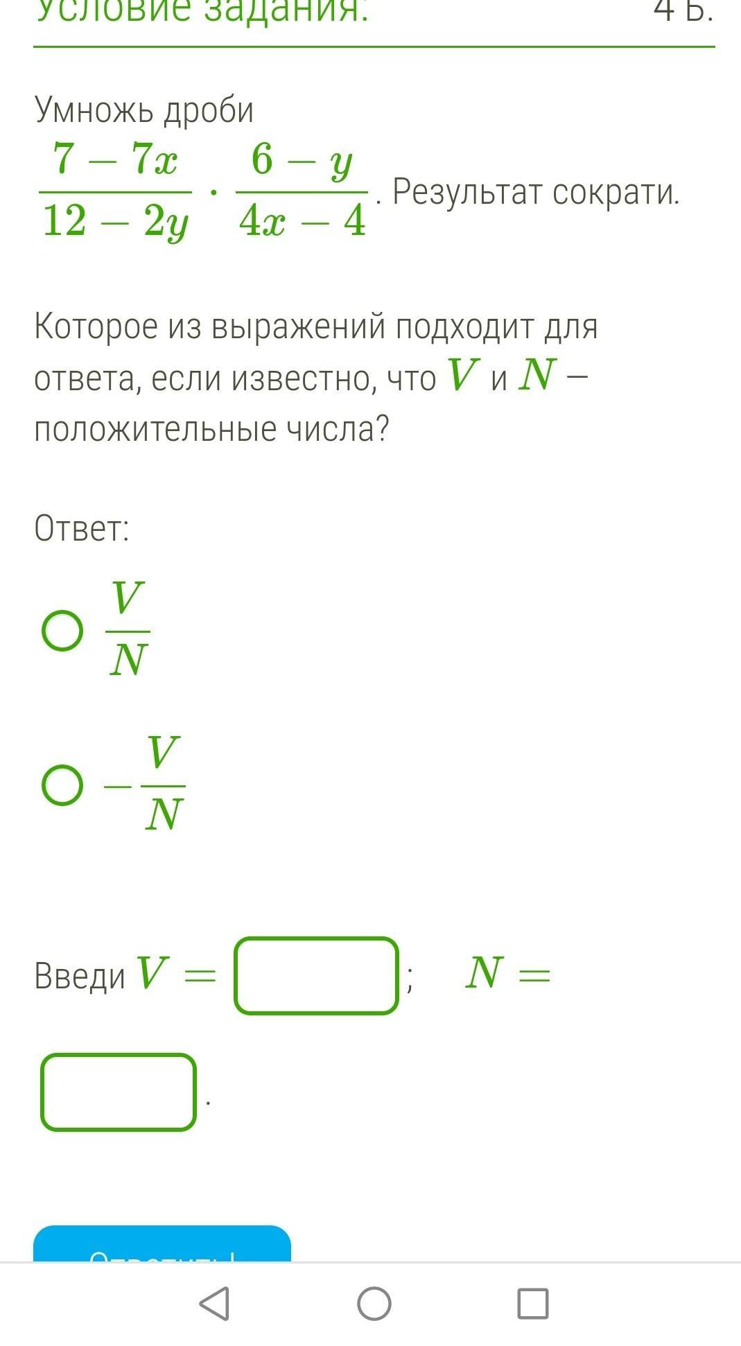 Умножь дроби 7−7x12−2y⋅6−y4x−4. Результат сократи. Которое из выражений подходит для ответа, если известно, что V и N — положительные числа? Ответ: VN −VN