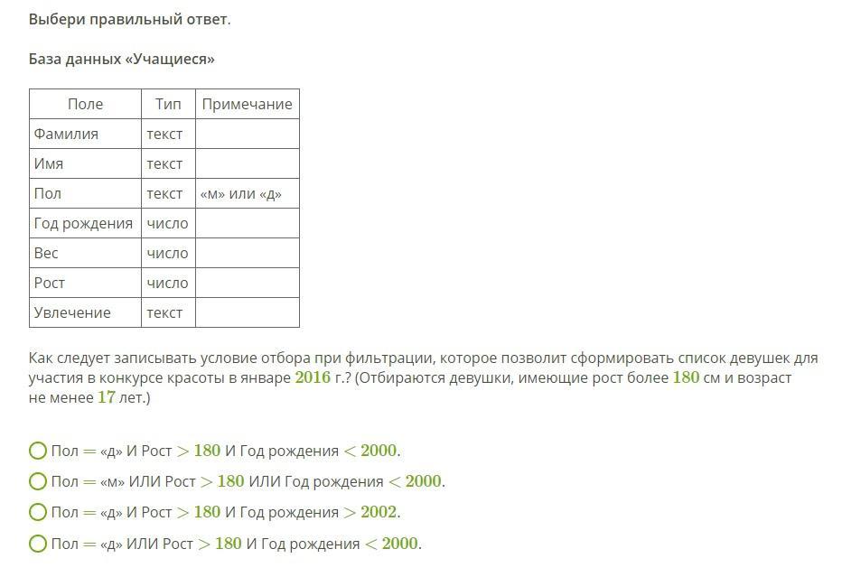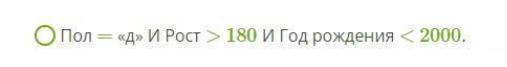 Пол "девушка" И рост более 180 (рост >180) И возраст не менее 17 ( год рождения <2000)